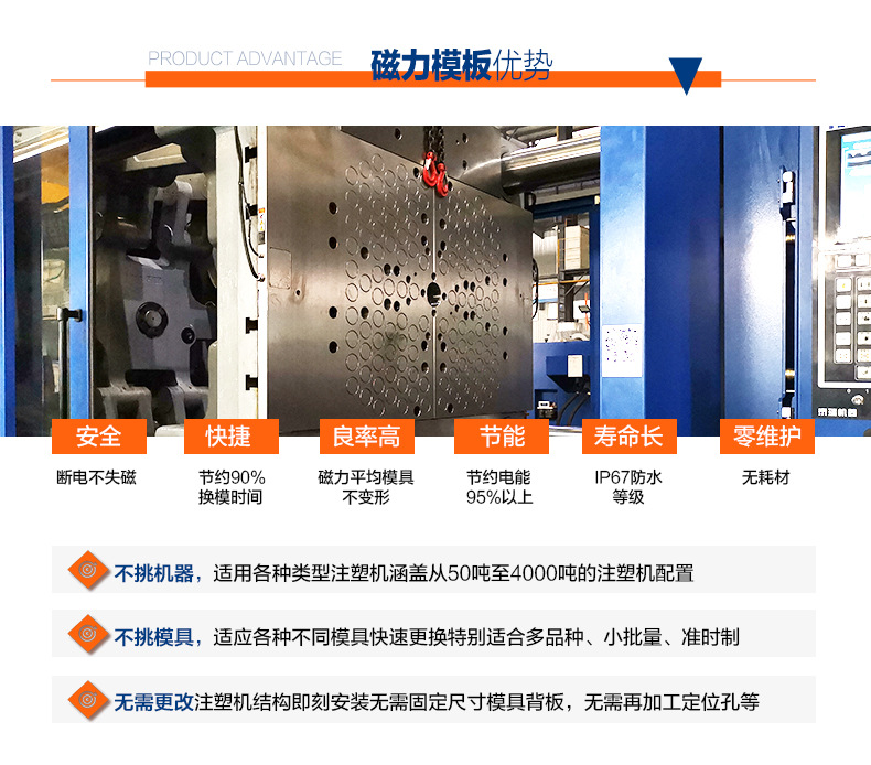 立式注塑機是目前中國發展最快的塑料機械之一,與工業發達國家的距離很近。 越來越多的制造業開始用磁性模板代替手動更換模具。 悍威磁電開發生產的磁性模板與立式注塑機的配套使用,增強了公司的核心競爭力。